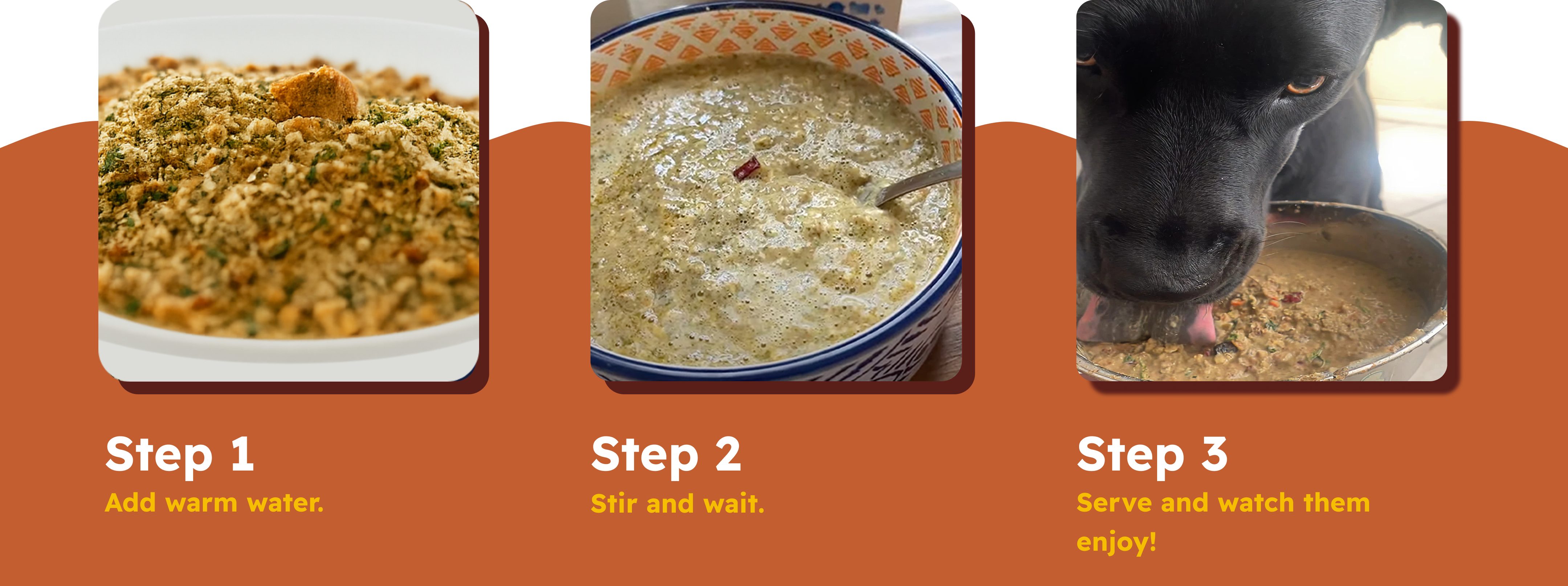 Just scoop, mix with warm water, and let it sit for about 3 minutes. The food will thicken into a hearty, fresh meal that your dog can enjoy immediately. There’s no cooking, freezing, or guesswork involved.